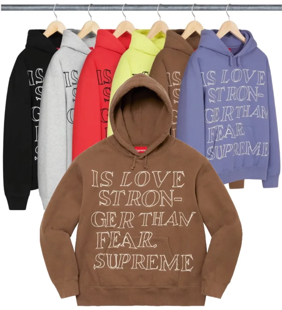 Hoodies i sex olika färger är samarbetets andra del, där texten ”IS LOVE STRONGER THAN FEAR. SUPREME” är broderad över hela bröstet på en annars väldigt klassisk luvtröja utan dragkedja.