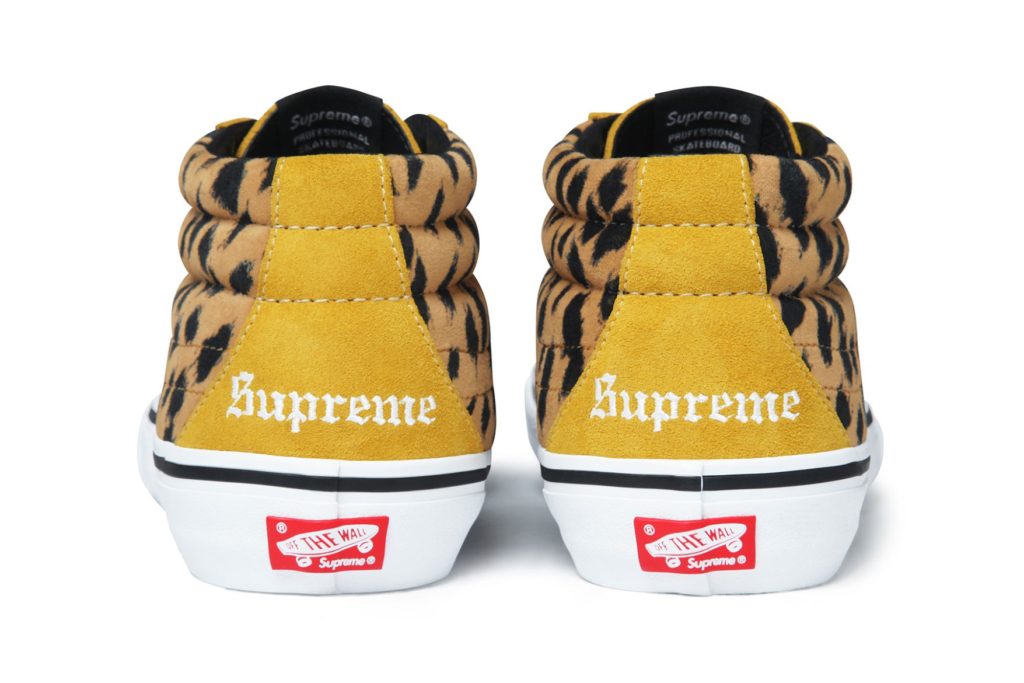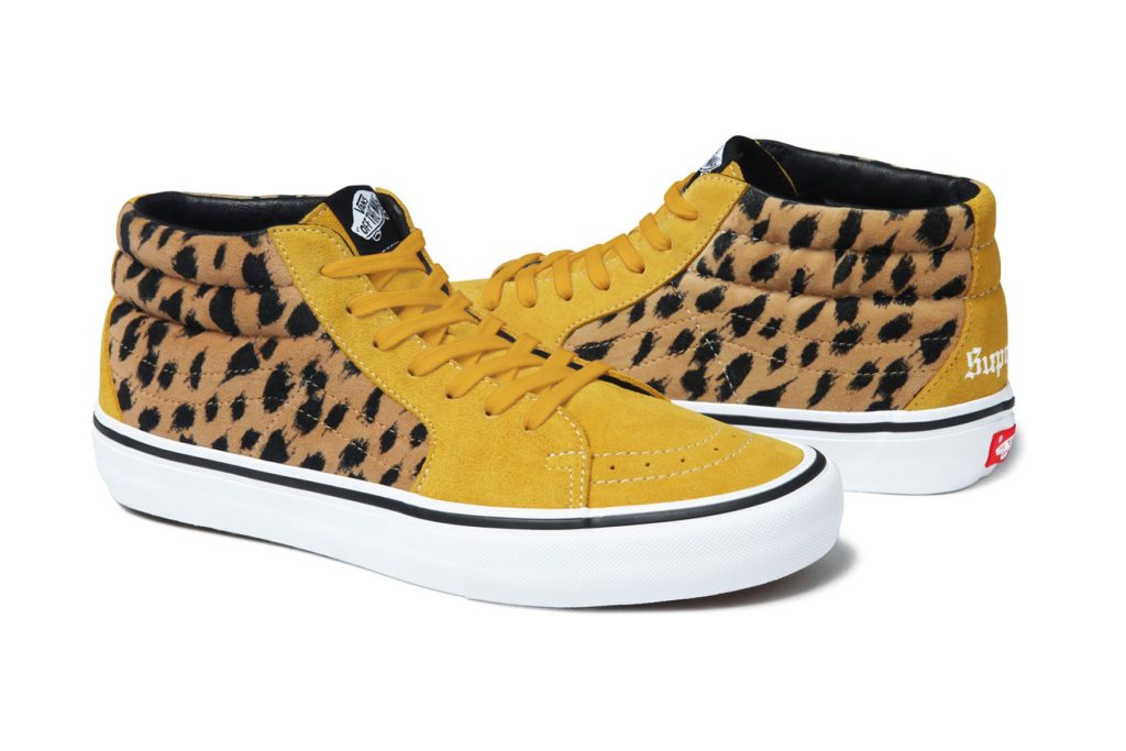 Supreme och Vans återförenas ännu en gång för ett samarbete. Man har valt Sk8-Mid Pro modellen för denna inställning av skor som erbjuds i fyra olika färgställningar (gult, rosa, blått och svart). Varje enskild färg har sedan parats ihop med leopard delar i sammet längs sidopanelerna. Slutgiltiga detaljerna innefattar kontrasterande vita skosnören, läder foder, vulkaniserade sulor, broderad branding på baksidan samt en röd Vans x Supreme stämpel på hälen
