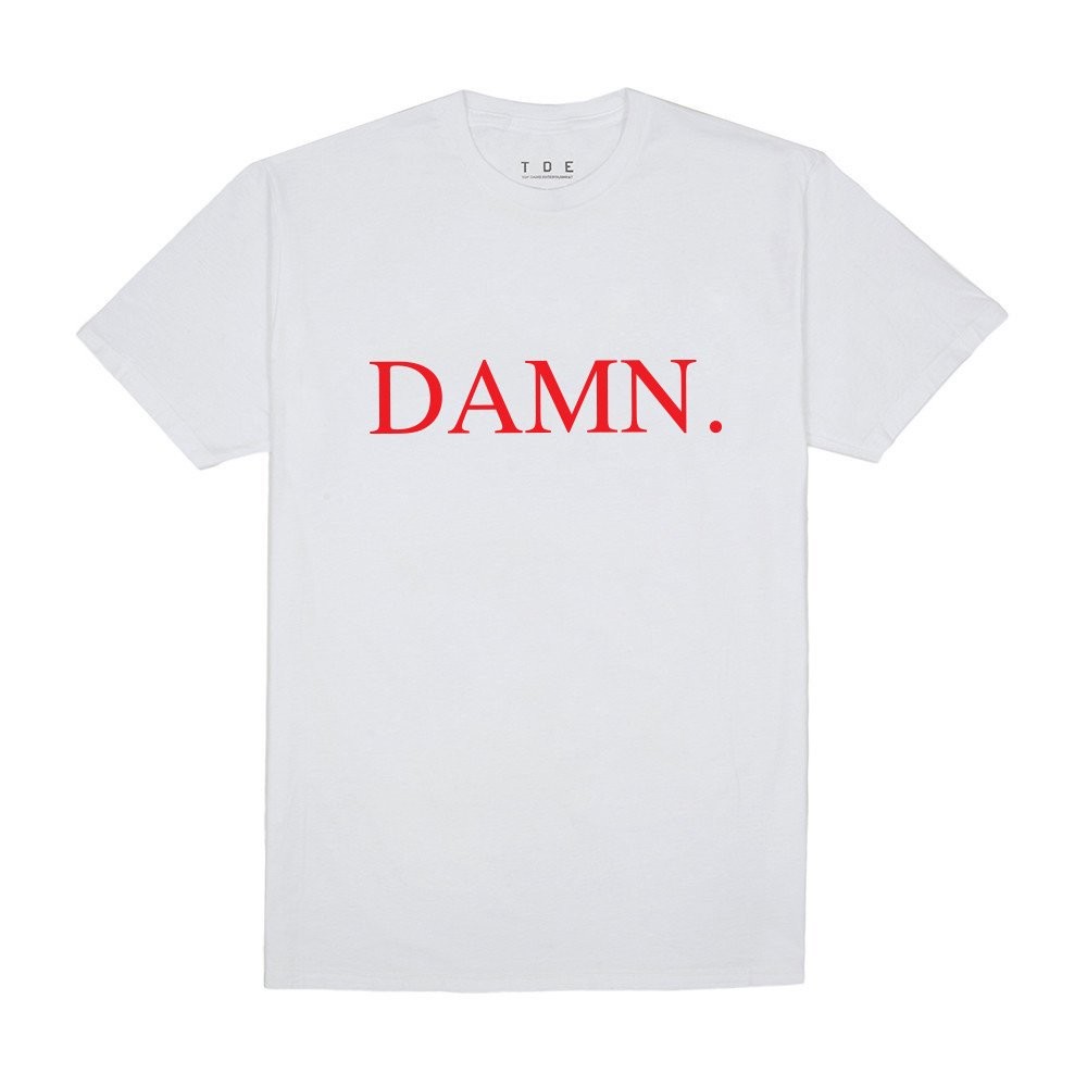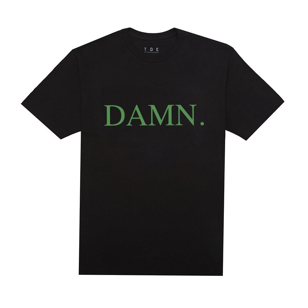 Dessa nya tees använder sig av samma typsnitt som albumomslaget, och finns tillgängliga i de två olika färgställningarna vit & svart. Den svarta t-shirten har ”DAMN.” skrivet i ett grönt typsnitt, medan den vita presenterar ett rött teckensnitt.