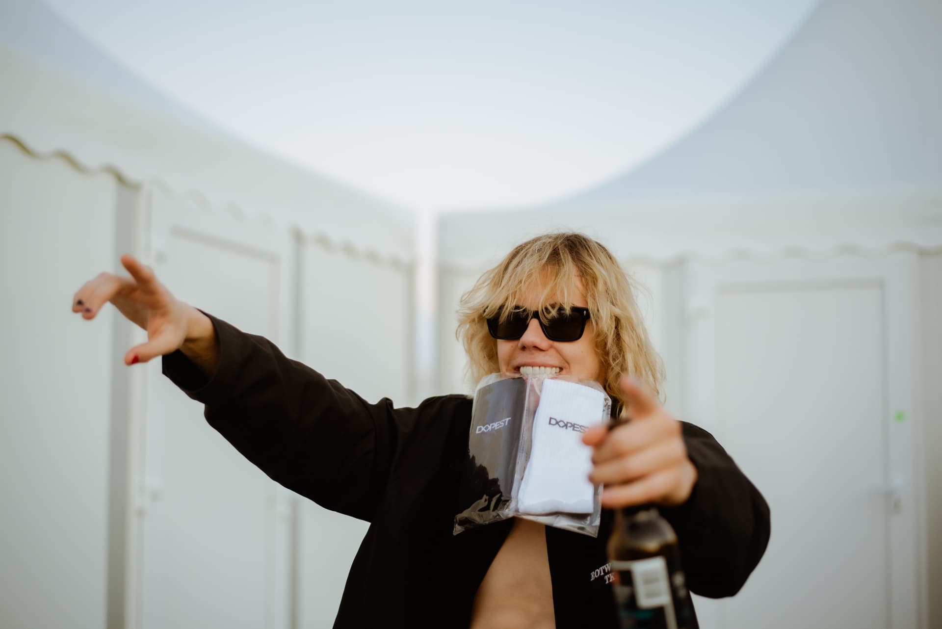 När LAROI slår sig ned lämnar även vi över en gåva för ”good luck”. Men inte några sedlar, utan istället DOPEST-strumpor. LAROI skiner genast upp. ”For me?! I’m gonna wear these!” säger han med ett leende.