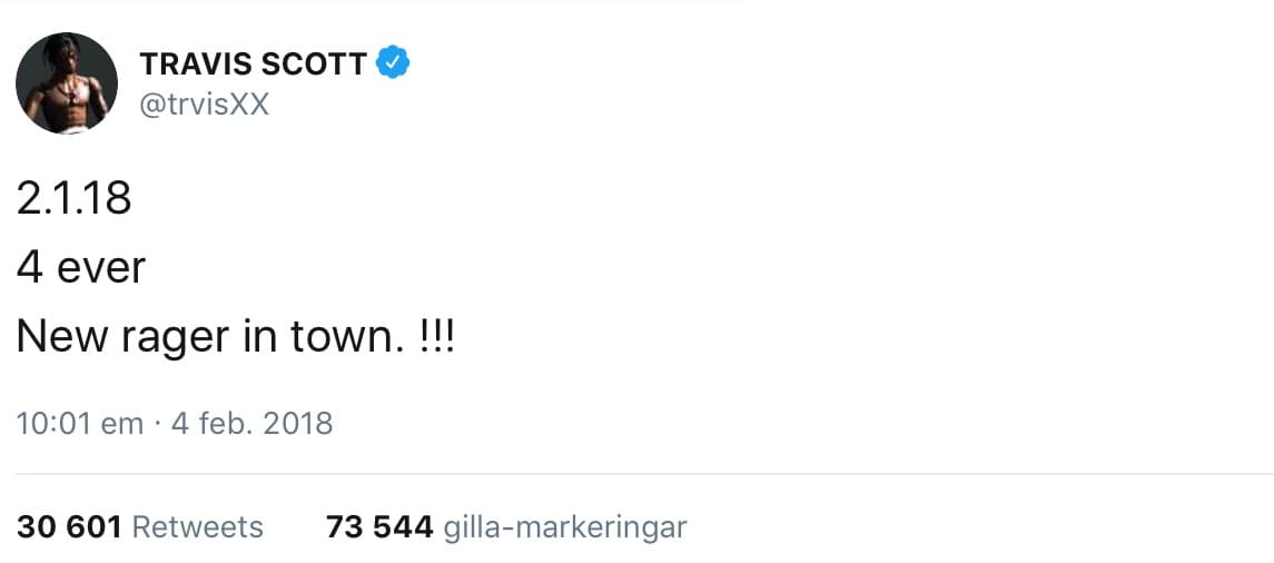 New rager in town. !!!— TRAVIS SCOTT (@trvisXX) February 4, 2018