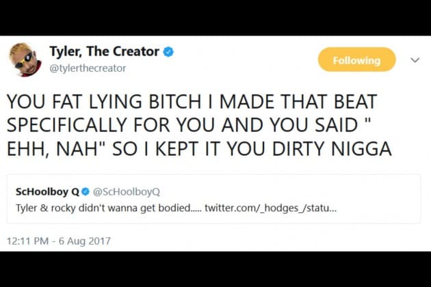 Tyler, the Creator släppte nyligen sitt omtalade album ”Flower Boy”. När ett fan nyligen kontaktade Tyler via twitter med kommentaren “The third verse of @tylerthecreator ‘Who Dat Boy’ should have went to ScHoolboy Q”, så var det inte Tyler som var den första att svara. Helt plötsligt var det ScHoolboy Q som kontrade med ett ganska drygt “Tyler and Rocky didn’t want to get bodied”.