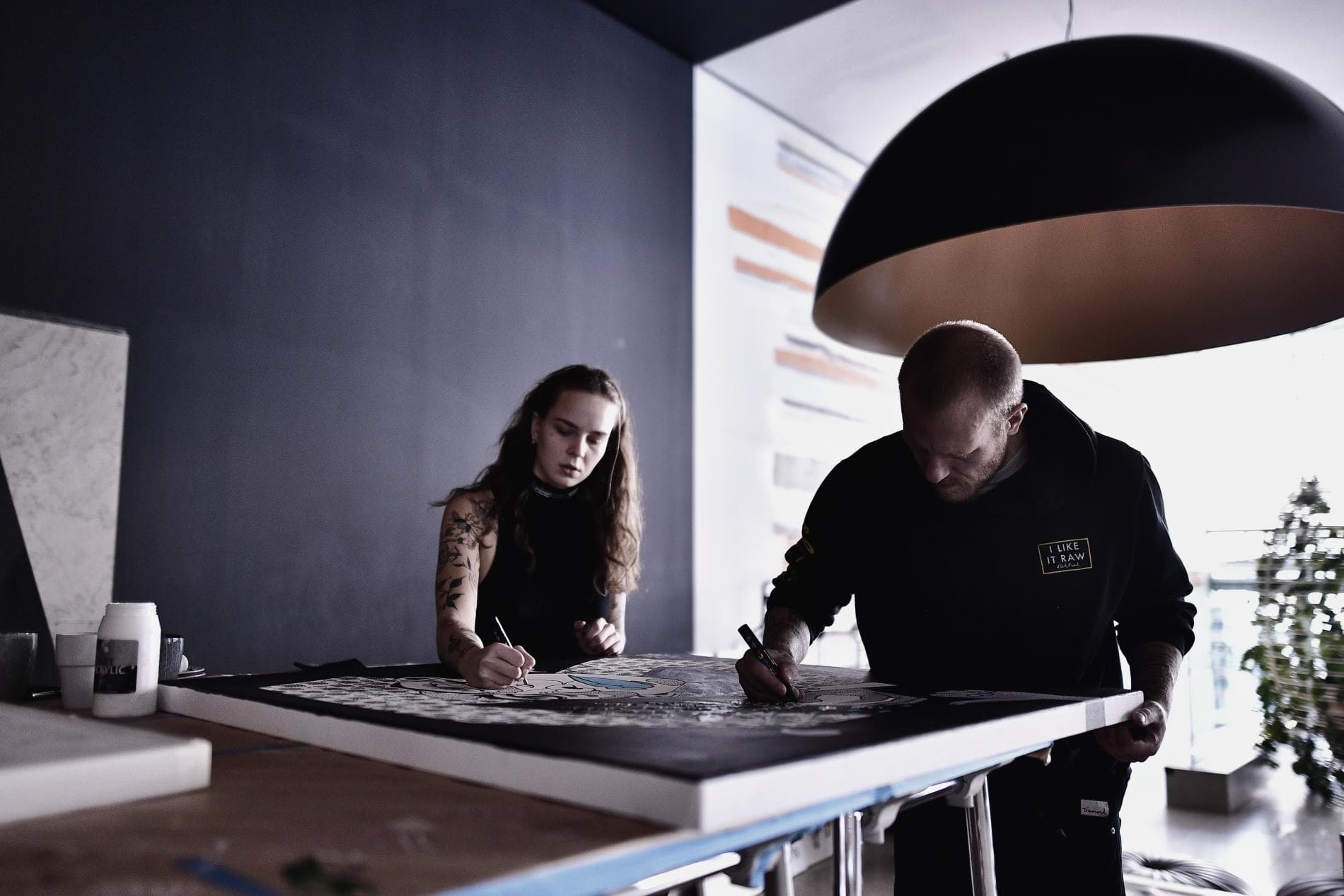 Thomas och Jacqueline har det senaste halvåret så gott som helt lagt det egna skapandet åt sidan för att försöka enas i gemensamma verk. De målar båda två samtidigt på samma duk och passar teckningar fram tillbaka paret emellan. Ibland händer det att en av dem målar över något som den andre pillat på i timtal.