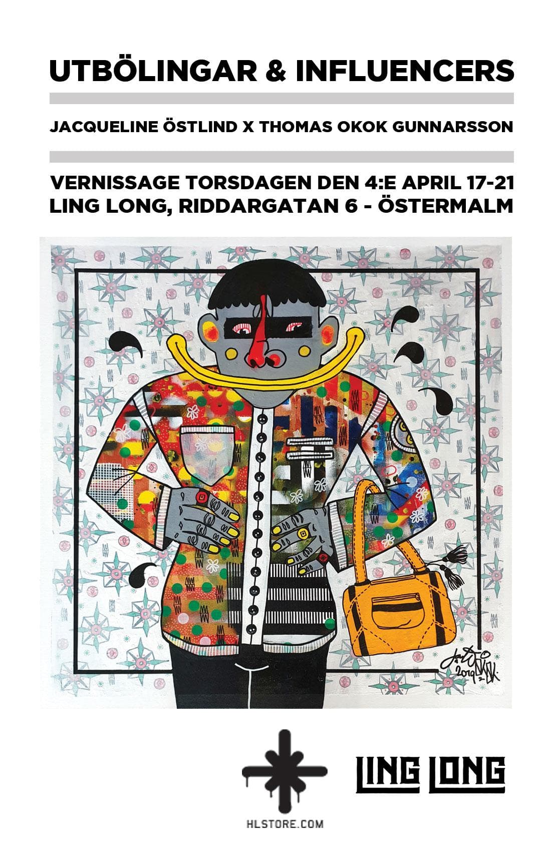 Vernissaget för Utbölingar & Influencers sker nu på Torsdag den 4:e April mellan 17.00 och 21.00 på restaurang Ling Long på Riddargatan 6. Alla är välkomna att titta förbi och konsten hänger uppe till sista April. För att spana in mer av Sveriges Snyggaste Rappares och Jacquelines konst checka deras Instagram-konton @artbyokok och @styrofoam_gallery.