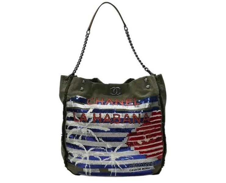 Kollektionen hämtar inspiration från Chanels eftertraktade La Habana-väska från 2016/17, och det märks direkt i detaljerna. Släppet kommer i tre färgställningar: olivgrönt, helvitt och en röd-vit-blå version som ligger närmast Chanels originalestetik. Samtliga modeller är byggda i slitstark canvas och pryds av randiga paljettpaneler längs sidorna, en oväntad men kaxig kontrast mot den annars avskalade siluetten.