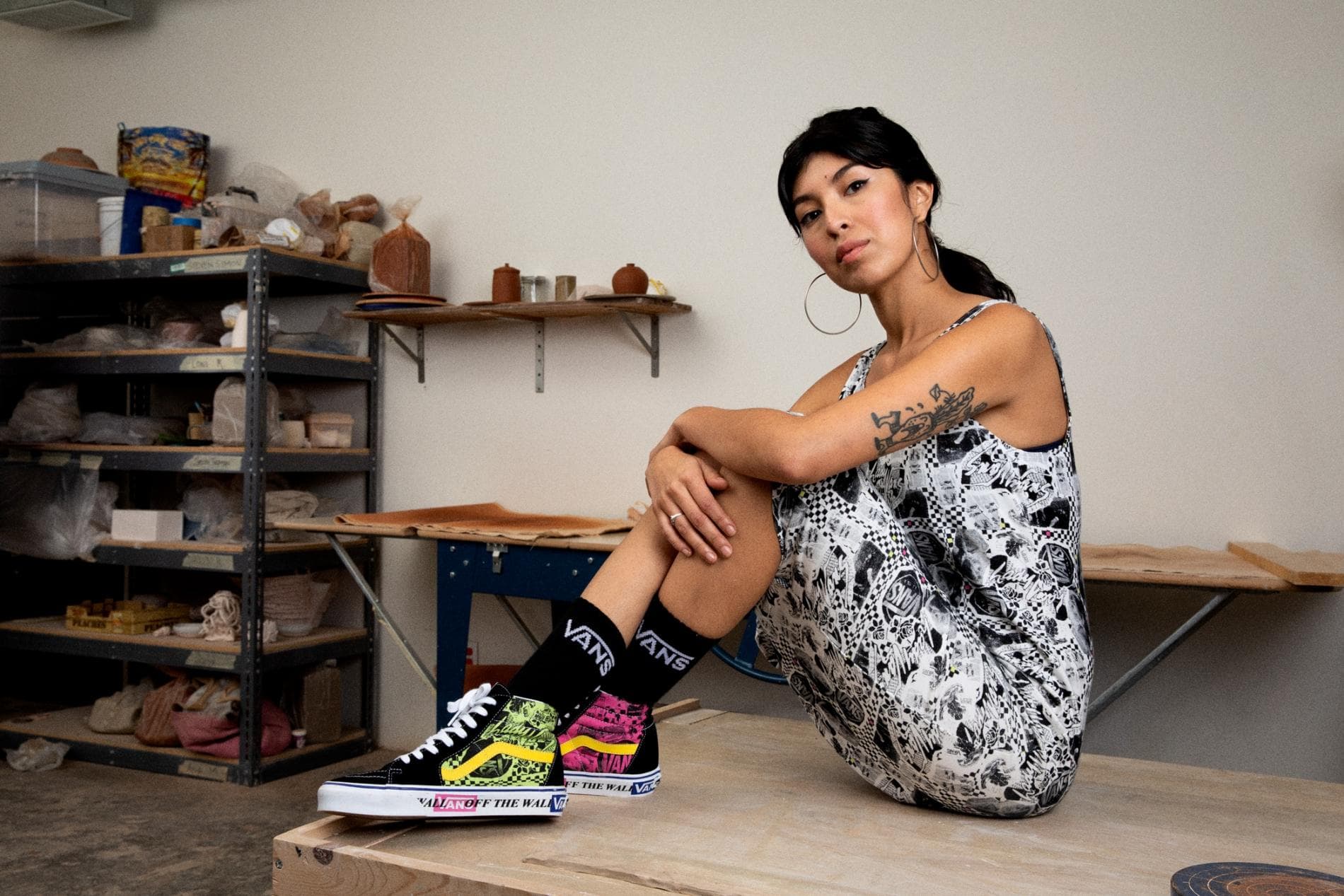 Skosortimentet innehåller både Lady Vans Era och Sk8-Hi, där båda har heltäckande zine-print och Vans ”Off The Wall” retrografik. Lady Vans Era kommer bli erbjuden i tre olika grafiska färgsättningar, inklusive azalea rosa och skarp grön. Två iterationer av Sk8-Hi rundar av skosortimentet och inkluderar svart och rosa, och har en kontrasterande skarp grön insida med en gul sidestripe på utsidan.