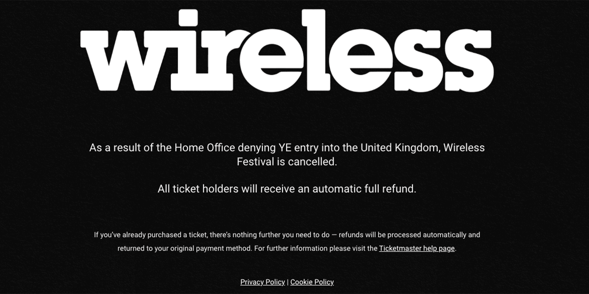 ”Home Office har nekat Ye inträde i Storbritannien. Som ett resultat ställs Wireless Festival in och alla biljettköpare kommer att få sina pengar tillbaka automatiskt”, skriver festivalen i ett officiellt uttalande.