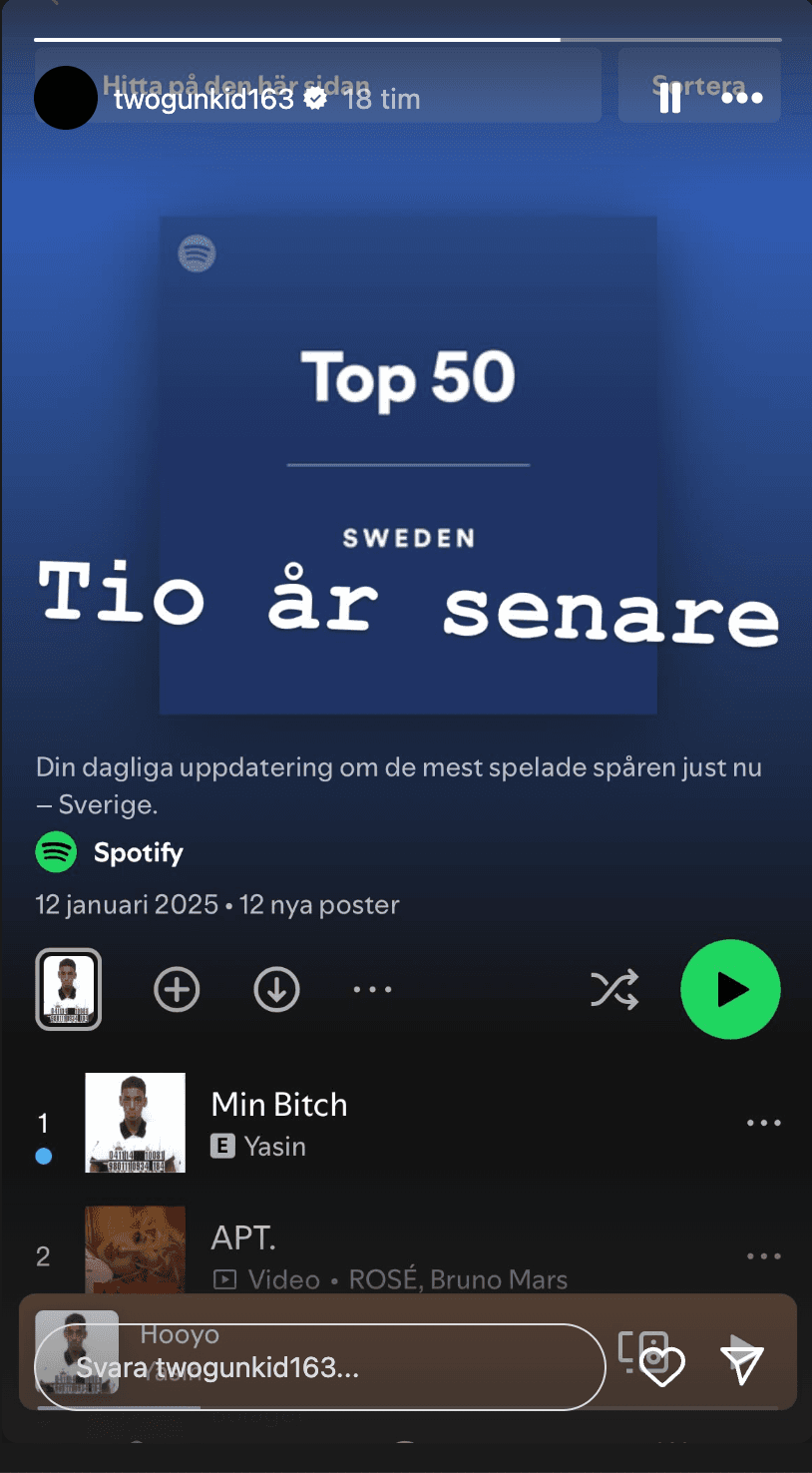 En av de mest efterlängtade spåren på samlingsalbumet var ”Min B*tch”, ett spår från 2015 som blivit en fanfavorit bland Yasins fans och en klassiker inom svensk underground-rap. Nu, tio år efter att den först började cirkulera online, har låten tagit sig till första plats på Spotify Top 50 Sweden.