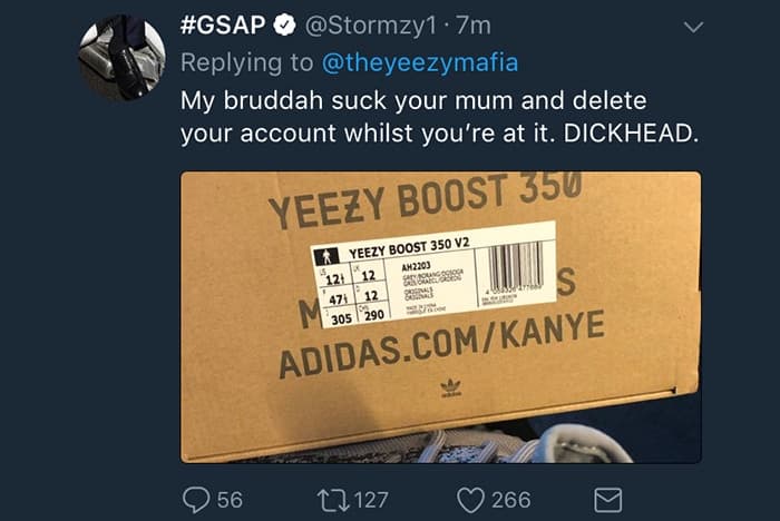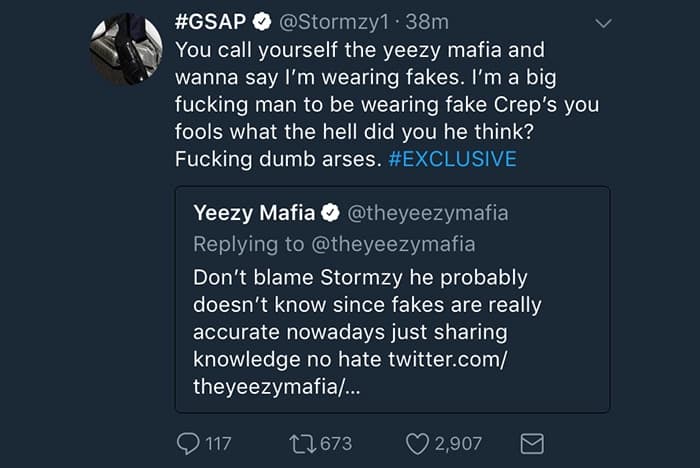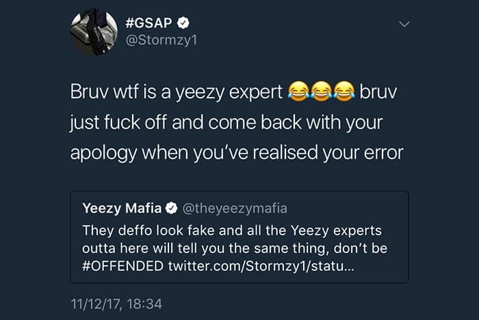 Engelska rapstjärnan Stormzy är den senaste artisten att bli utkallad för att ha på sig fake Yeezys. Efter söndagens EMA framträdande då Stormzy rockade ett par Yeezy BOOST 350 V2 ”Beluga 2.0”, tog de ökända Yeezy entusiasterna ”Yeezy Mafia” tillfället i akt att ifrågasätta skornas legitimitet via en serie tweets. Även den berömda Yeezy experten ”Yeezy Busta” blev inkallad att ta en titt på Stormzys skor, för att avgöra om skorna faktiskt var oäkta.