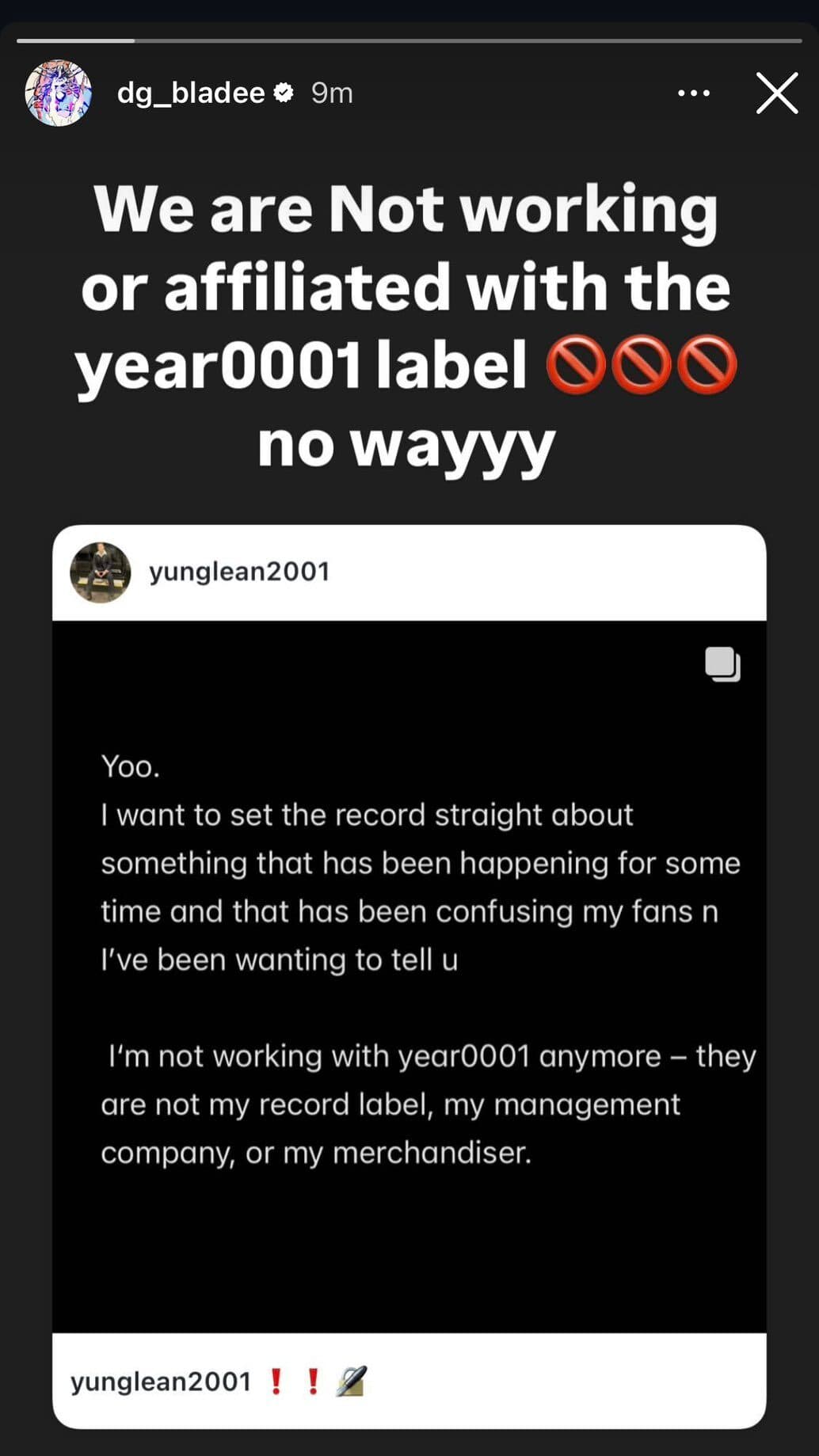 Även Bladee tog avstånd från bolaget när han delade Leans post via sin Instagram Story, där han la till att de varken jobbar eller är kopplade till sitt tidigare label.